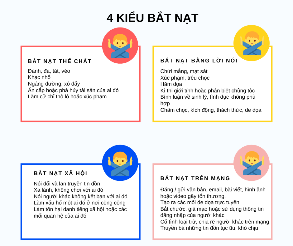 Bắt nạt có thể được định nghĩa theo nhiều cách khác nhau và thường được chia thành bốn loại cơ bản như sau: – Bắt nạt thể chất, bắt nạt bằng lời nói, bắt nạt xã hội, bắt nạt trên mạng. Dưới đây là các hành động thường gặp của mỗi loại bắt nạt